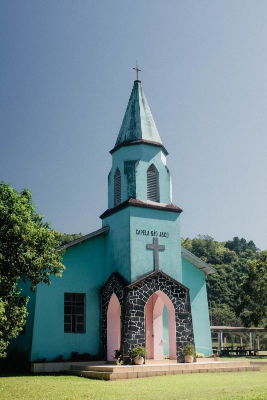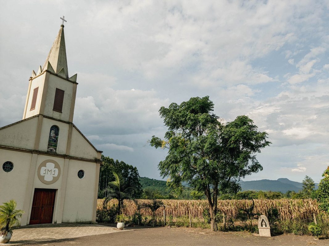 Chegando no povoado, o ânimo logo mudou. Além do asfalto liso, a estrada voltava a ficar mais plana e até com algumas descidas. Um pouco adiante, passamos pela igreja da região, no centro da localidade. Ao lado dela, havia um salão paroquial onde serviam almoço. Como já passavam das 13hs, decidimos que era hora de fugir um pouco do sol e parar pra comer.
