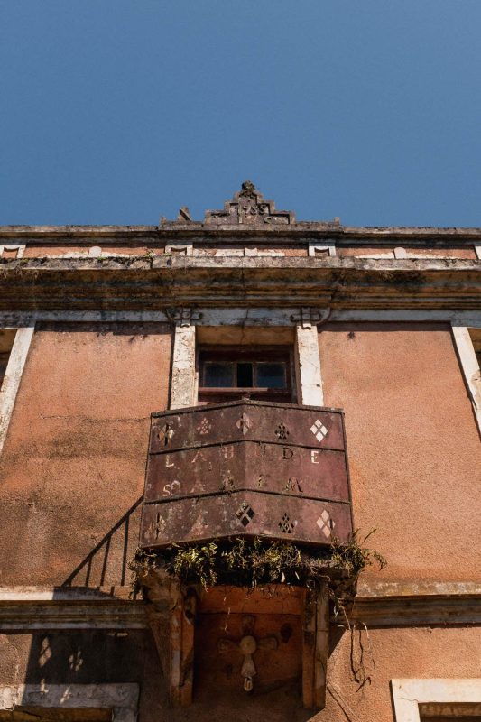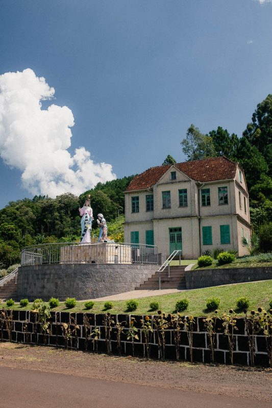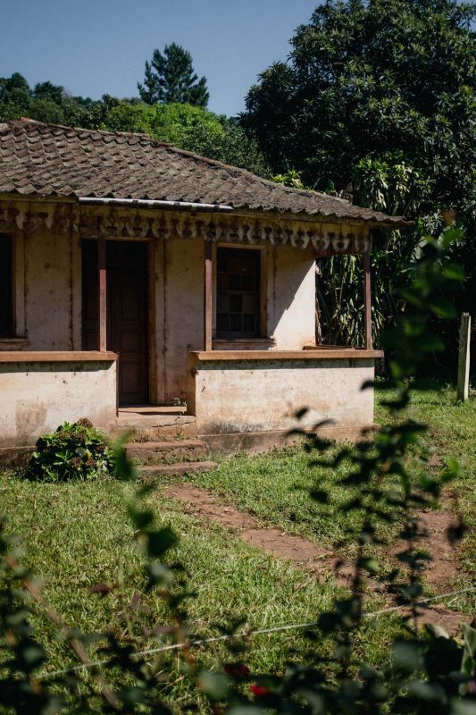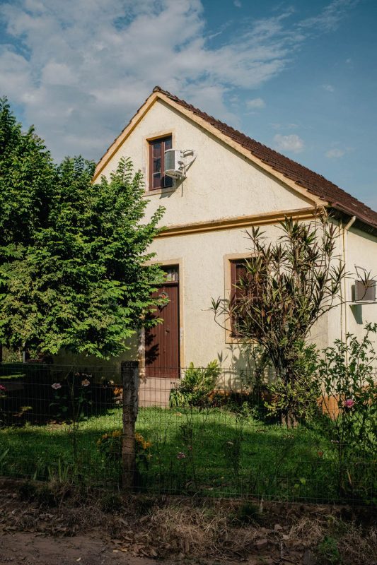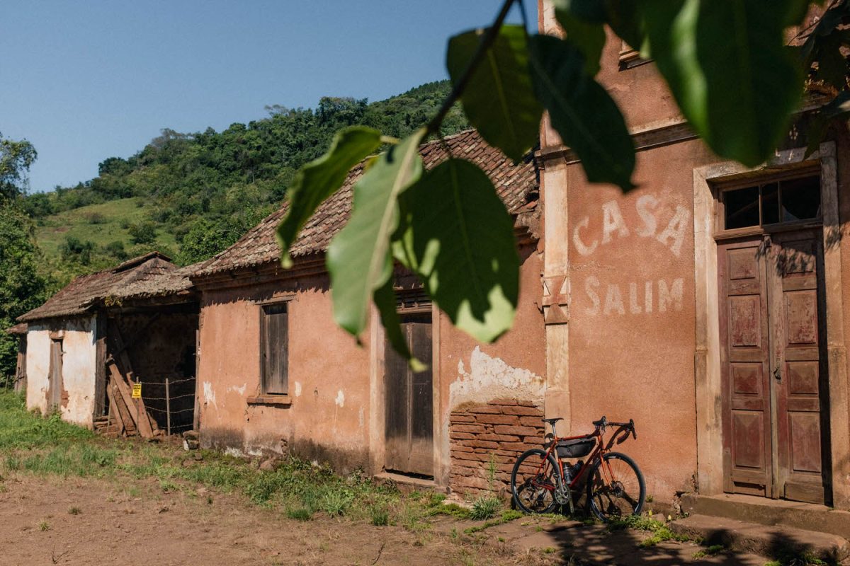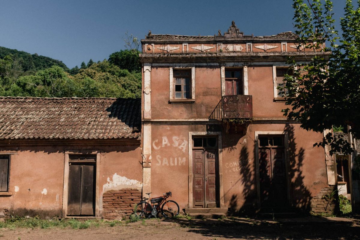 Naquela manhã, logo ao acordar já dava pra sentir o calor que nos esperava. Partimos pro centro da cidade, onde deixamos o carro estacionado na frente da prefeitura de Rolante. Ali mesmo montamos as bikes e iniciamos o pedal. Seguinto pela direção do acesso ao Caminho das Pipas, saímos do asfalto e ingressamos em uma estrada de terra bem plana, ótima de pedalar. Ali, passamos por casarões e sobrados antigos, vários deles restaurados e ainda em utilização. Um deles nos chamou a atenção o suficiente pra nos fazer parar e fotografar. As paredes laranjas deterioradas, e o cenário cercado de verde formavam uma atmosfera bucólica, que nos pareceu muito interessante.