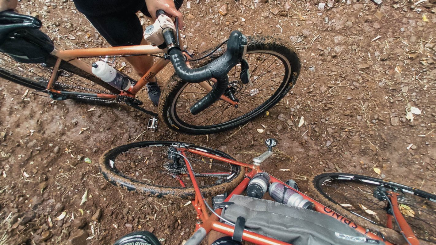 Em pouco mais de 10 minutos, o que era um dia quente de sol se transformou num temporal forte. A velocidade em que o tempo pode mudar em regiões serranas é realmente impressionante. Como já estavamos no meio da descida, não restava opção senão seguir descendo. Em alguns pontos, devido ao barro que se formava, foi ficando dificil manter tração, e o jeito foi descer da bike e seguir a pé por mais alguns quilômetros. Quando finalmente chegamos no fim da descida, ao lado da Cascata das Andorinhas, a chuva começou a parar.